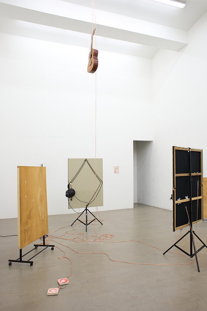 The sound installation by Henning Bohl, Sergei Tcherepnin, and myself are two years old. However, as long as the sound is distributed through bike helmet paintings using transducers, all is coming to present. Sports helmets are in quite dynamic orientations in the video.