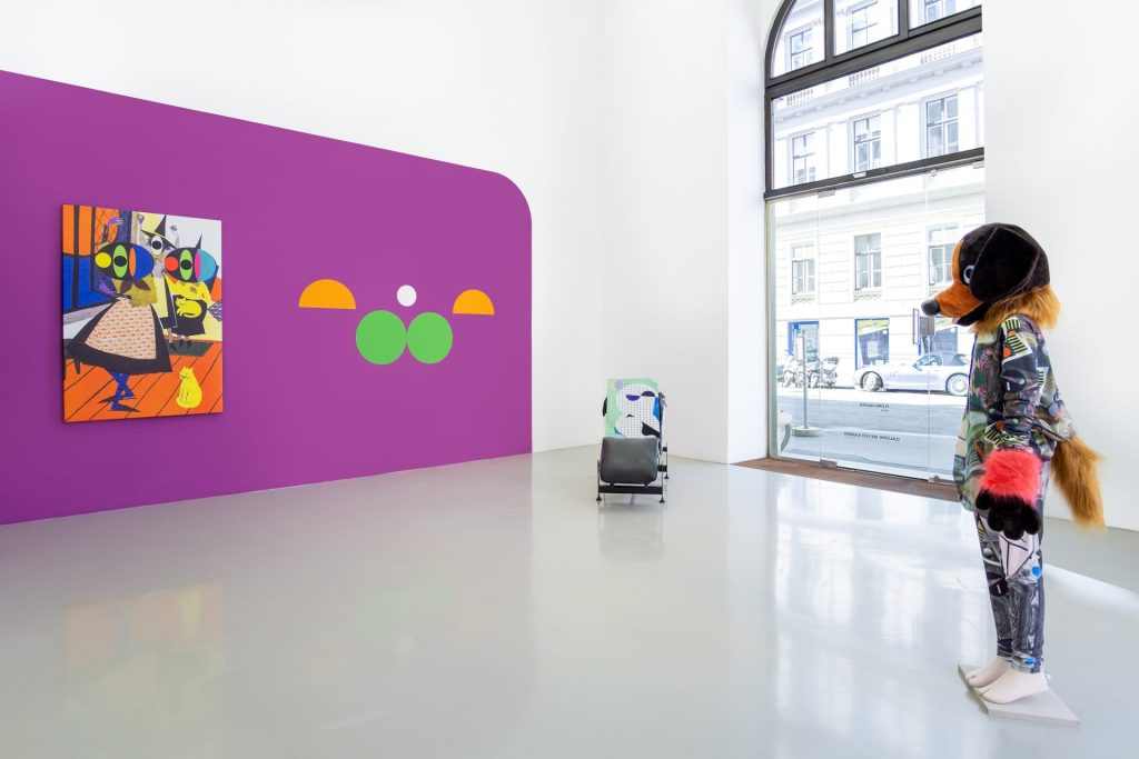 Die Ausstellung umfasst eine Reihe von Wandbildern, die als Ergänzung und Hintergrund für Bilder, Zeichnungen und digitale Kompositionen dienen. Arbeiten aus der Serie Queer Deco, in der Minoliti digital interveniert und die idealisierten Räume modernistischen Lebens – Darstellungen von pseudo-futuristischem Komfort – mit geometrischen Gebilden bevölkert, die in der Lage sind, den Ort sowohl zu bewohnen als auch zu transformieren, ihn über seine techno-patriarchalische so genannte Effizienz hinaus zu bringen und als perfekte Desorganisatoren zu agieren: koexistierende, schwebende Formen, die sich weder um Arbeit, Produktivität noch um irgendeine andere Form der Unterdrückung kümmern. Eine weitere Gruppe von Arbeiten stammt aus der Serie GSCF, ein Akronym für geometrische Sci-Fi-Cyborgs. Es handelt sich um “typische” Minoliti-Zeichnungen, die Landschaft und Natur mit fließenden, unruhigen Airbrush-Pinselstrichen in etwas unnatürlichen Farbkombinationen neu interpretieren und durch das Auftauchen unbestimmter, aber aktiver und interagierender Wesen wie Blasen, Formen, Pseudo-Blumen, Schatten und Roboter, weiter verfremden. Die Serie von Zeichnungen mit dem Titel Geo Sci Fi ist ebenfalls in diesem Bereich angesiedelt und zeigt viele dieser exzentrischen Charaktere in biotechnischer Hinsicht noch detaillierter. Cyborg Mom stammt aus der gleichen Zeit und bezieht sich auf eine Gruppe von Bildern in Zusammenarbeit mit Minolitis Mutter. Daraus entstand eine eigenwillige Serie von Digitaldrucken, die aus üppigen Kompositionen und überraschenden Farbpaletten bestehen. In der Ausstellung sind, wie häufig in Minolitis “Kunsträumen” einige der Furries zu sehen – Mensch/Tier-Mannequins in Kleidern mit eigenen Drucken. Sie teilen einen Moment der Kontemplation mit den menschlichen Betrachter*innen vielleicht ohne sie wirklich zu brauchen, ist ihre Anwesenheit eine spekulative Autopoiesis der Kunst für die Kunst mit der Kunst.