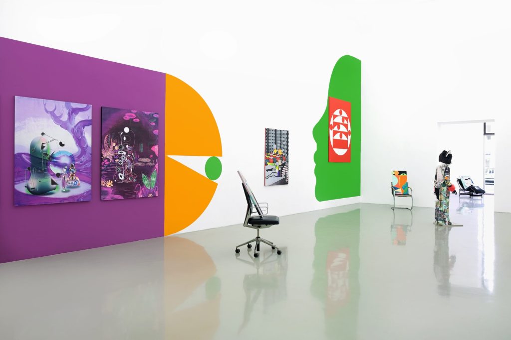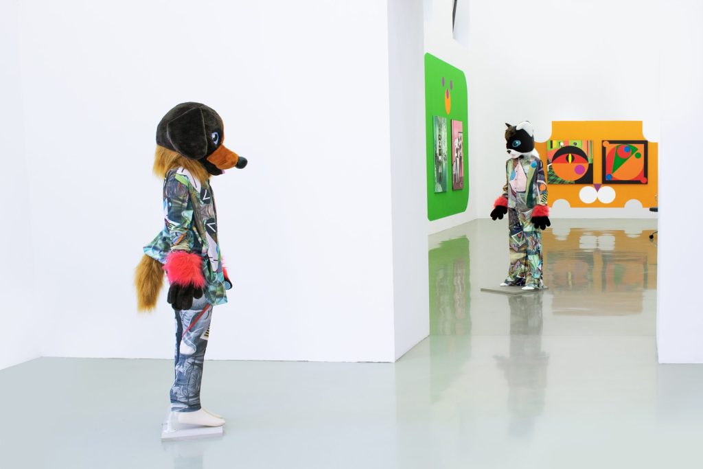 Faithful to Minoliti’s expansiveness, this exhibition includes a series of murals which serve as complement and backdrop to paintings, drawings and digital compositions. Pieces from the ‘Queer Deco’ series, in which Minoliti digitally intervenes and populates the idealized spaces of modernist living —those images of pseudo-futuristic comfort— with geometrical entities capable of inhabiting the place as well as transforming it, taking it beyond its techno-patriarchal so-called efficiency and acting as perfect disorganizers: merely co-existing, floating shapes oblivious to work, productivity or any other form of oppression. Another group of pieces comes from the ‘GSCF’ series, an acronym for geometrical sci-fi cyborg. These are classic Minoliti in their re-imagination of landscape and nature through the use of fluid, frolicky airbrush strokes in somewhat unnatural color combinations, further rarefied by the appearance of indeterminate yet active beings like bubbles, shapes, pseudo-flowers, shadows and robots, all interacting with one-another. The series of drawings titled ‘Geo Sci Fi’ also exists in this realm and shows many of those eccentric characters in more bio-technical detail. From the same period, ‘Cyborg Mom’ references a group of paintings created by Minoliti in collaboration with their mother, which then led to a quirky series of digital prints which are equal parts voluptuous compositions and unexpected color palettes. The exhibition also includes a couple of Minoliti’s furries, the human-animal mannequins dressed in the artist’s prints that frequently animate the spaces of their art. They are able to share the moment of contemplation with human spectators, perhaps not really needing them, their presence as a speculative autopoiesis of art for art with art.