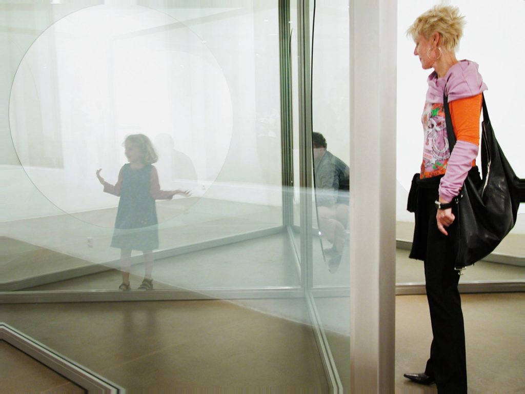 Im Pavillon „Influenced by Moon Windows“ stehen Bild und Spiegelbild des Besuchers in der Mitte der Konstruktion (und vielleicht das Bild und Spiegelbild anderer Besucher innerhalb oder außerhalb des labyrinthischen Pavillons).