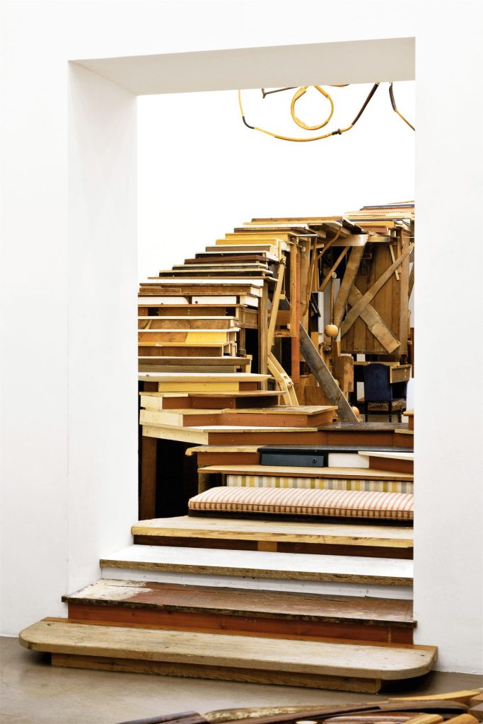 Installing a grand staircase and a levitating giant chandelier, built of discarded furniture and matured timber, until January 16, 2010 the artists group „gelitin“ transforms the Meyer Kainer Gallery into „Palais Keiner Mayer“, as an allusion to the location of the gallery at the Palais Eschenbach.