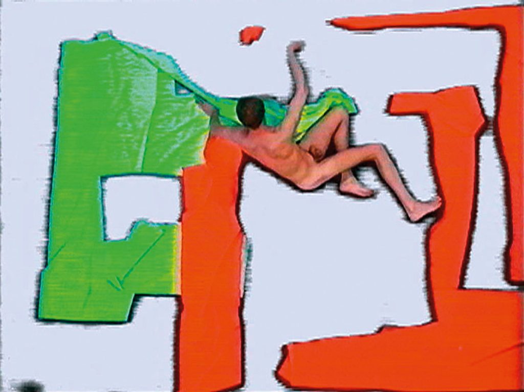 Auf der am Boden liegenden Wand zeigt ein Monitor ein Video. In diesem Film ist der Künstler zu sehen, wie er versucht mit Stoffen, die für das Chroma-Keying verwendet werden, ein Patchwork / ein geometrisches Bild zu arrangieren, sich durch die Tücher windet und zu keinem Ende kommt. Alle 60 Sekunden wird eine der Farben mittels der Chroma-Key-Videotechnik ausgeblendet und durch die Farbe Weiß/Wand ersetzt.