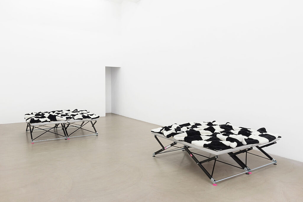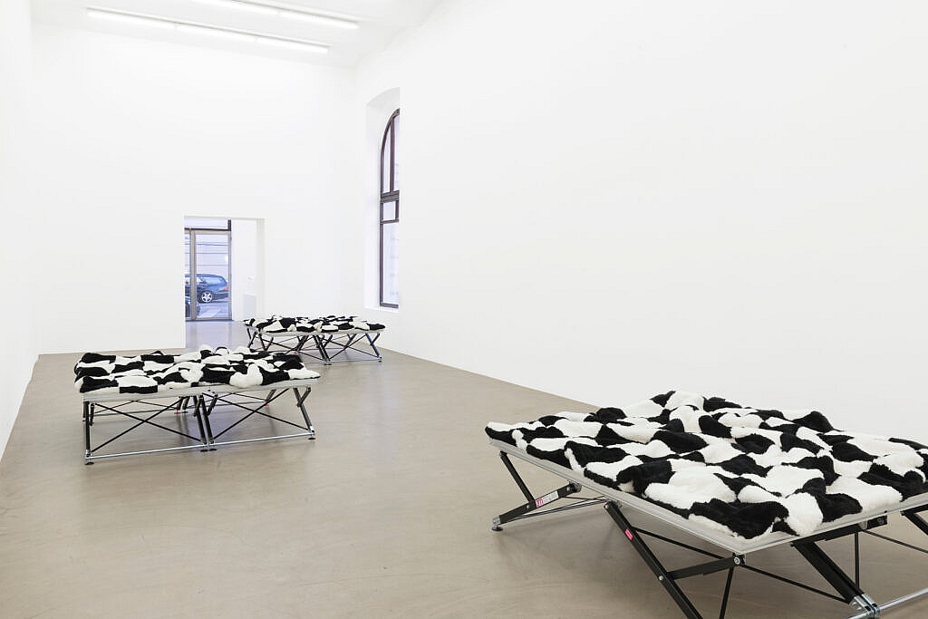Die Decken auf den Bühnenpodesten in der Galerie Meyer Kainer referieren diese Zusammenhänge um das Schachbrettmuster. Die Platzierung der Decken bewirkt einen theatralisch schwebenden Effekt, der die Komponente geometrische Malerei und ihre theoretische Verweigerung narrativer oder illusionistischer Gesetzmäßigkeit hervorhebt. Die Decke als Textil erinnert zudem an das Kostüm des Harlekins, der sich ebenfalls von Reglements freispielt, nämlich von jenen der gesellschaftlichen Ordnung.