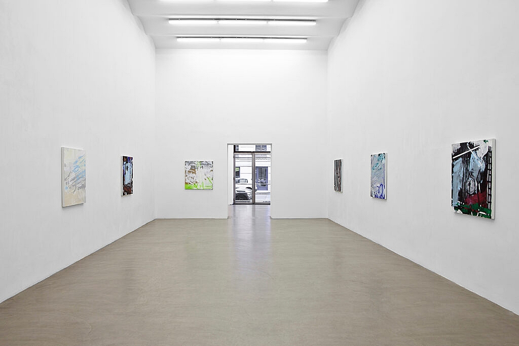 The development from abstraction to the grid and the dissolution of the grid in Zobernig’s works takes a new turn here. Just a few additional elements of his visual vocabulary increase the variability of Zobernig’s syntax exponentially, which in the present exhibition results in a highly complex texture of the individual paintings. The modi operandi tested earlier are now less applied in the serial sequencing than to the interior structures of the works. The venue for this is the square canvas, where the individual syntactical modules put themselves in relation to one another, like an experimental setup with an ambivalent outcome.