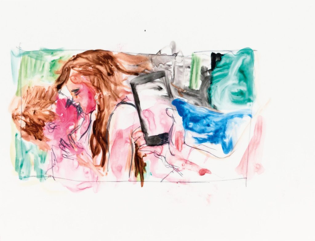 The original watercolors have been reproduced as digital prints on transparent “static cling” vinyl film. Slightly magnified and stuck onto sheets of opaque Plexiglas, these images want to approach the anxious flimsiness of their content, clinging to screens with only the force of their own attraction, or attention.