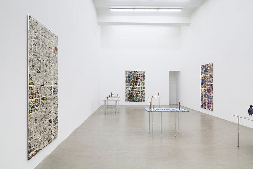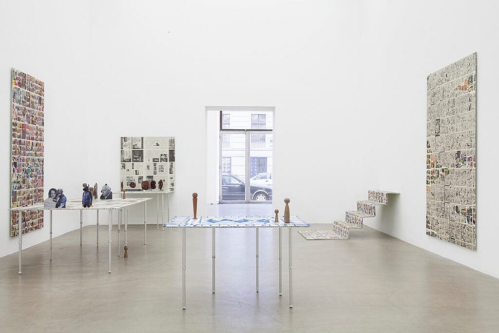 The show also incorporates several tables that the artist refers to as “games”. They appear to be game settings or model constellations. These table settings are made out of paintings standing on aluminum telescopic legs, as well as wooden and acrylic game figures that are arranged in constellations, groupings, formations. These schematic remakes of social spheres can be manipulated and rearranged by the public during the opening hours of the show.